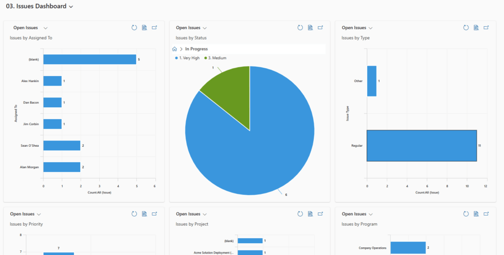 Dashboard Reporting in Power Apps and Power BI: Managing all project data enables you to set up real-time dashboards to track status across all the projects in the system. Using built-in Power Apps dashboards or interactive Power BI reports, you can get immediate visibility into the status of project with the ability to drill down as needed.