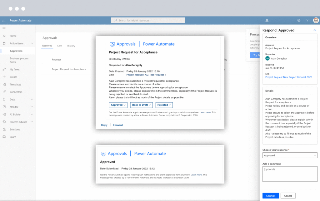 Reviewers and approvers can act on the request directly from the email. A Power Automate workflow automatically updates the status of the request in BrightWork 365.
