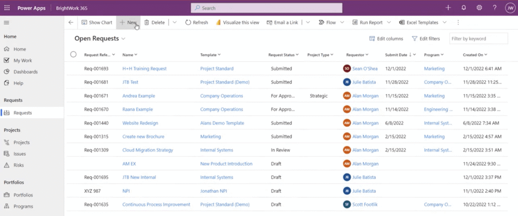 BrightWork 365 integrates with Microsoft Power Automate to help you create and standardize a system to manage your new project requests. This project intake dashboard gives you ample visibility and control to optimize your project pipeline.