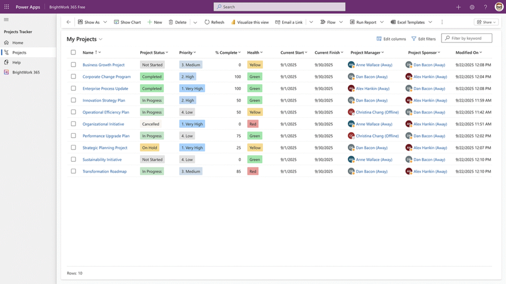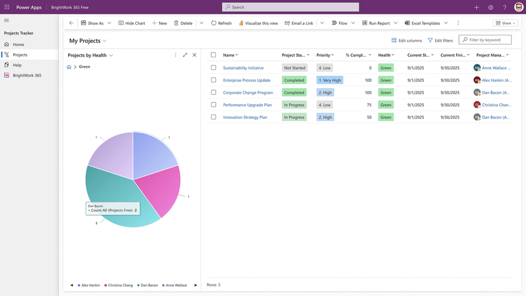 BrightWork 365 Free simplifies project tracking by providing an easy-to-use, no-cost solution built on Microsoft 365 and Power Platform.
