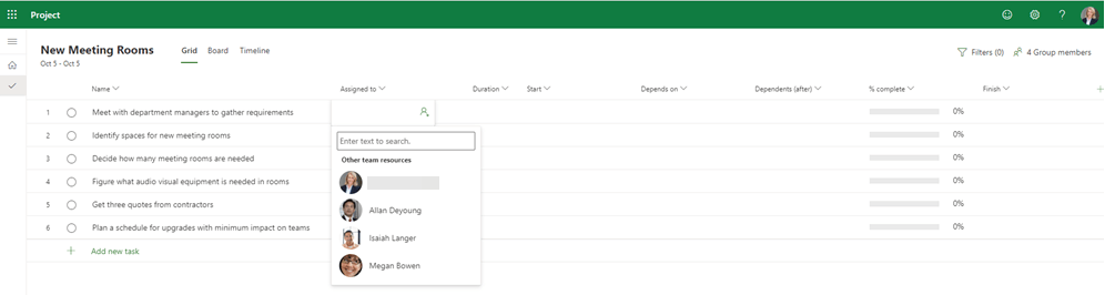 Now, it’s time to create a project team and assign tasks. As mentioned above, Project for the Web uses Microsoft 365 groups for sharing. This means you’ll need to create a new group or use an existing group for tasks. In this example, I have created a new group with four team members.