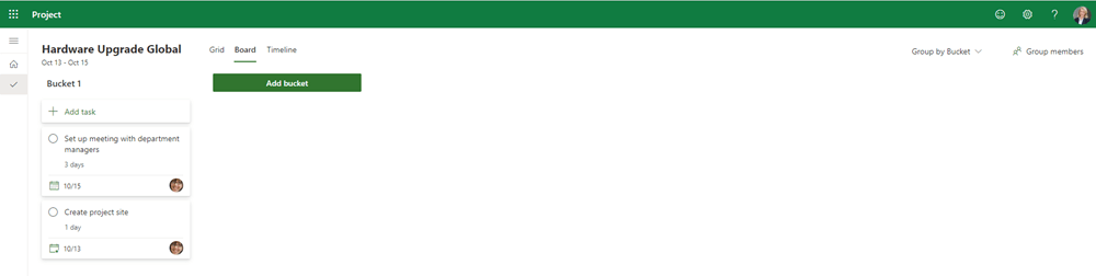 Board is a visual way to manage tasks by buckets. The cards display the task, duration, due date, and owner.