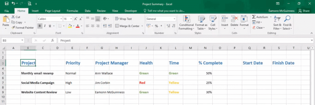 Many people use Excel to manage a project, and why not? It’s really easy to get started. Here’s a screenshot of a simple “Projects Tracker” in Excel.