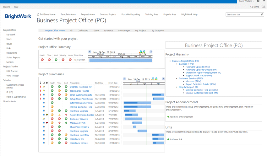 As you do this for lots and lots of projects, you will end up with many projects in the tracker, or others in their own individual sites in the SharePoint environment. So every project has its own environment, it’s own controls and project site. But with BrightWork, you can bring them together and aggregate up to portfolio- and program-level dashboards for a view across all the projects in the organization.