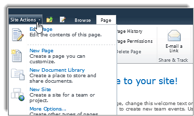 SharePoint 2010, one of the earlier SharePoint on-prem versions, stands out with its distinct ‘Site Action’ button in the header.