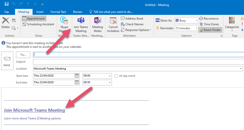 If you have installed the Teams desktop client, you can schedule a Teams meeting in Outlook using the Teams add-on. When scheduling a new meeting, select ‘Join Teams Meeting’ in the ribbon. A link will be inserted into the meeting request.