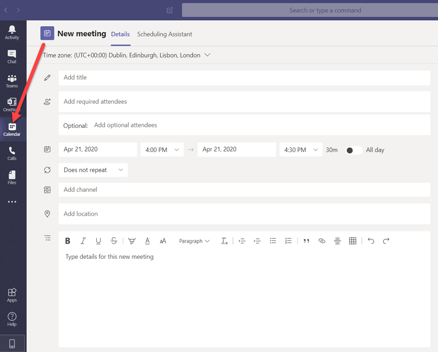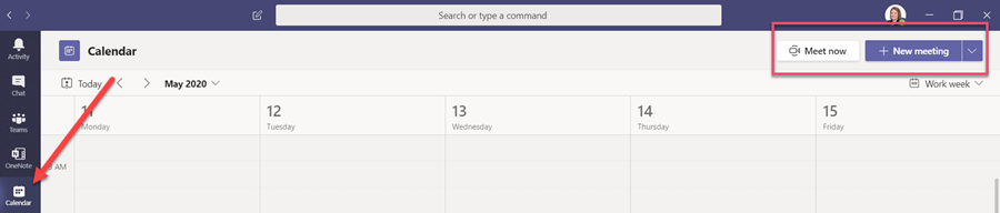 Navigate to ‘Calendar’ in the left-hand menu of the app. There are two meeting options in the right-hand corner: Meet Now and New Meeting.