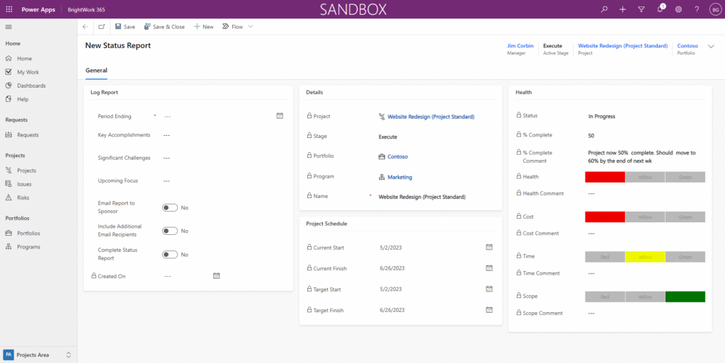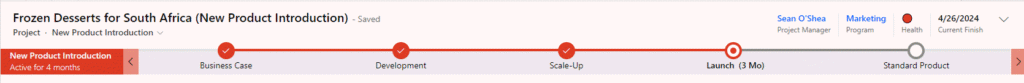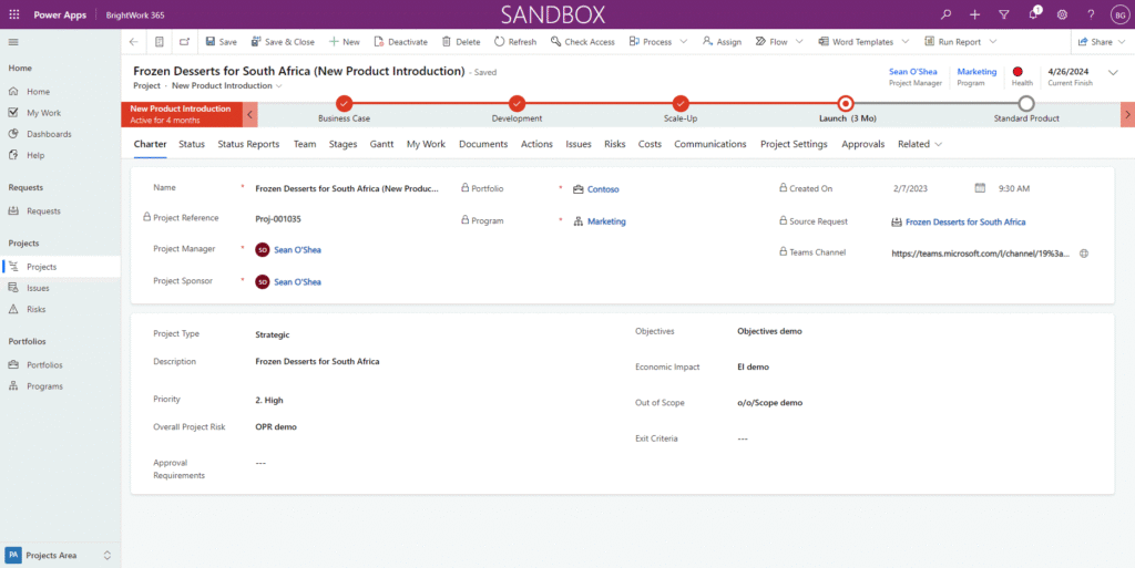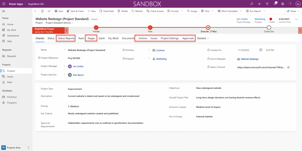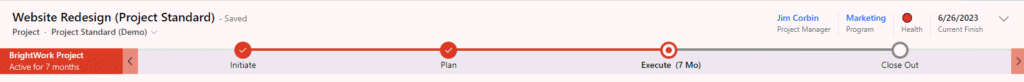 Standard template in BrightWork 365 has a typical approach to Project Management, as shown in the Business Process Flow at the top of the template