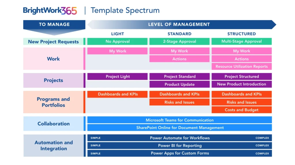 BrightWork 365 combines all of these Microsoft 365 apps and capabilities into a suite of project and portfolio management templates, enabling you introduce new, modern processes at scale in Microsoft 365.