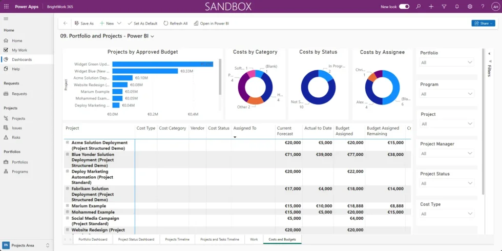 • Power Platform: Use Power Apps to deliver forms and apps for project management, Power BI for interactive project reporting, and Power Automate for workflows, such as automated project request management.