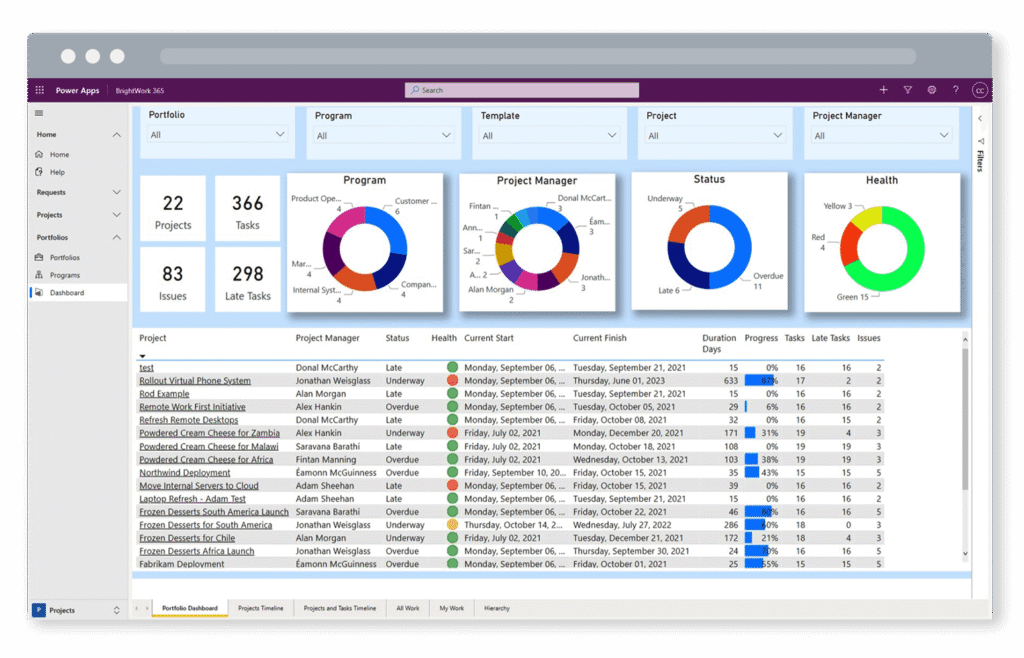 Once you have selected the right projects to start, you move into the ‘Project’ area of your BrightWork 365 PPM tool. These projects categorize into different programs, which further roll up into portfolios. Can you keep an eye on the progress of different projects and programs across portfolios? Yes, you can. You can get an overview of the performance of your entire project portfolio with a few simple clicks. Dashboards enabled with Power BI and Microsoft Power Apps give you interactive visual aids to view and monitor the status of your entire project portfolio.