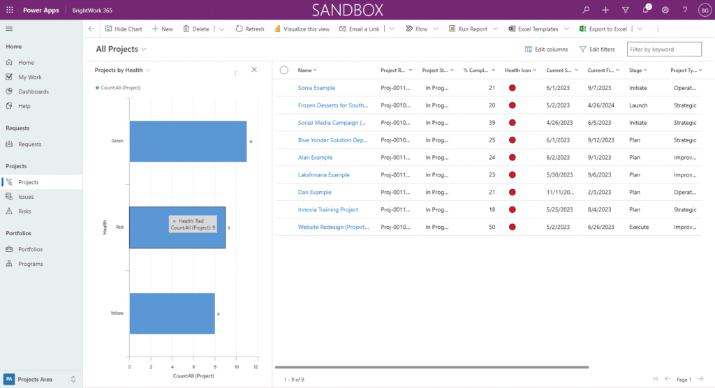 You can start with simple Power Apps dashboards and later add more interactive Power BI reports. BrightWork 365 offers several out-of-the-box Power Apps dashboards sorted by Health, Status, Sponsor, Project Manager, etc., with drill-down capabilities.