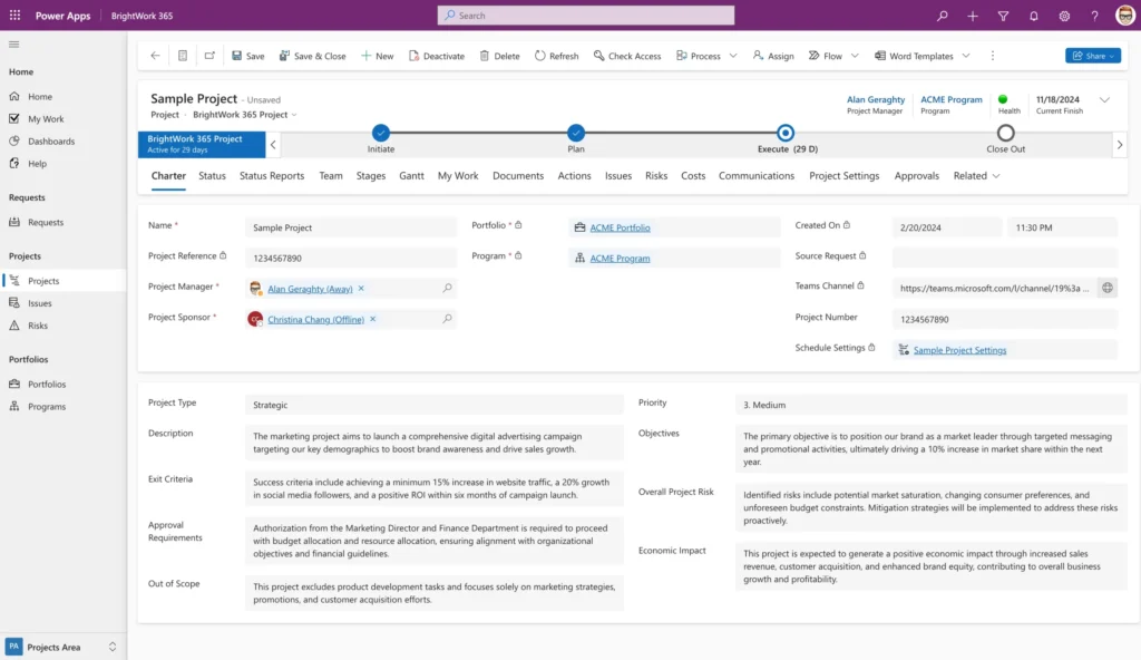 If you’re looking for a PPM tool that seamlessly integrates with the different products of Microsoft such as Power Apps, you should have a look at BrightWork 365. BrightWork 365 leverages your existing Microsoft 365 suite to connect with Power BI dashboards for reporting, Power Automate for automates business workflows, SharePoint Online for document management, Outlook for communication and alerts, and a lot more. You can find all these capabilities in one place, with a single tool.