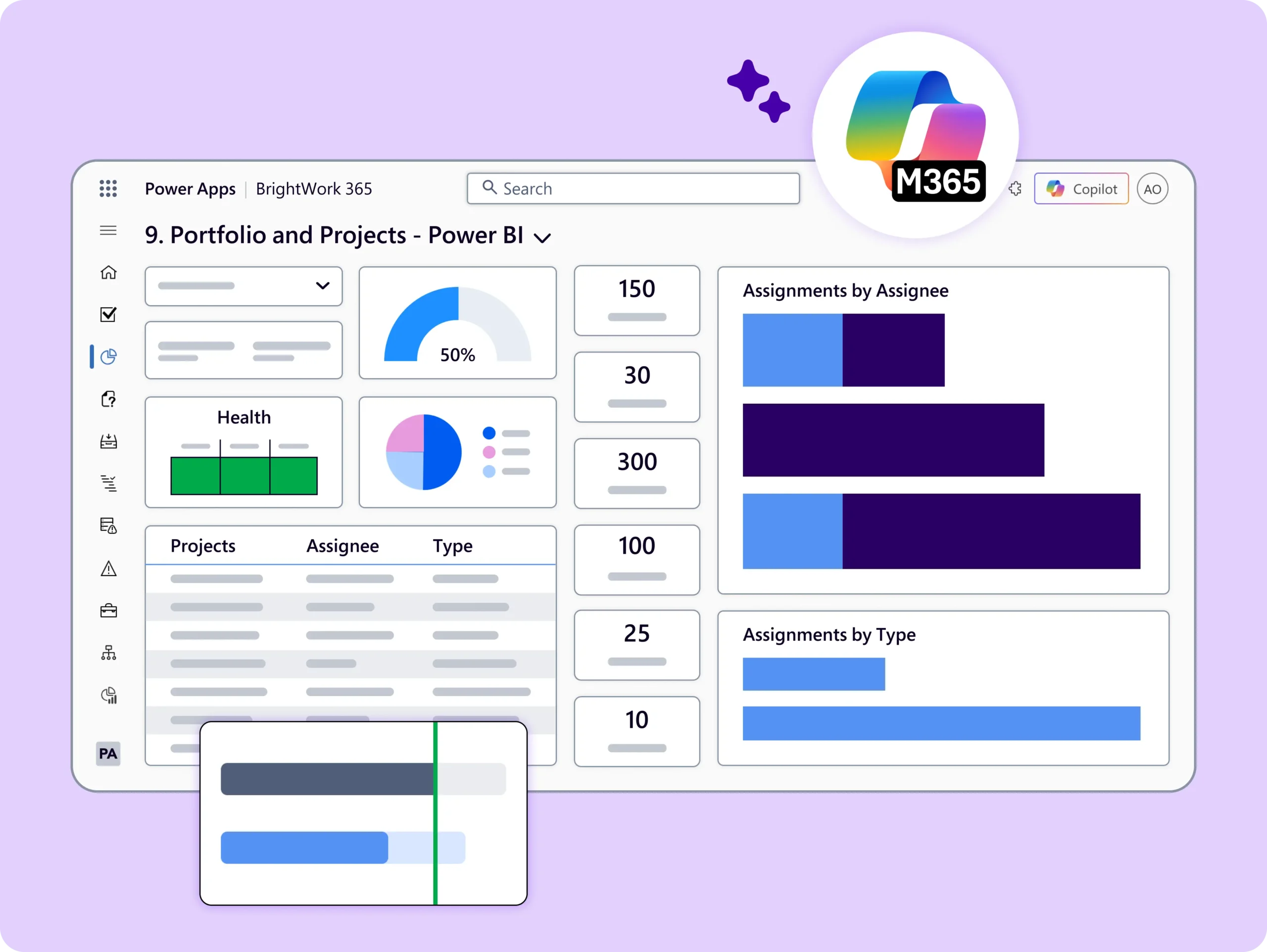 • BrightWork 365 integrates with Microsoft Apps to create interactive reports for tracking project tasks.