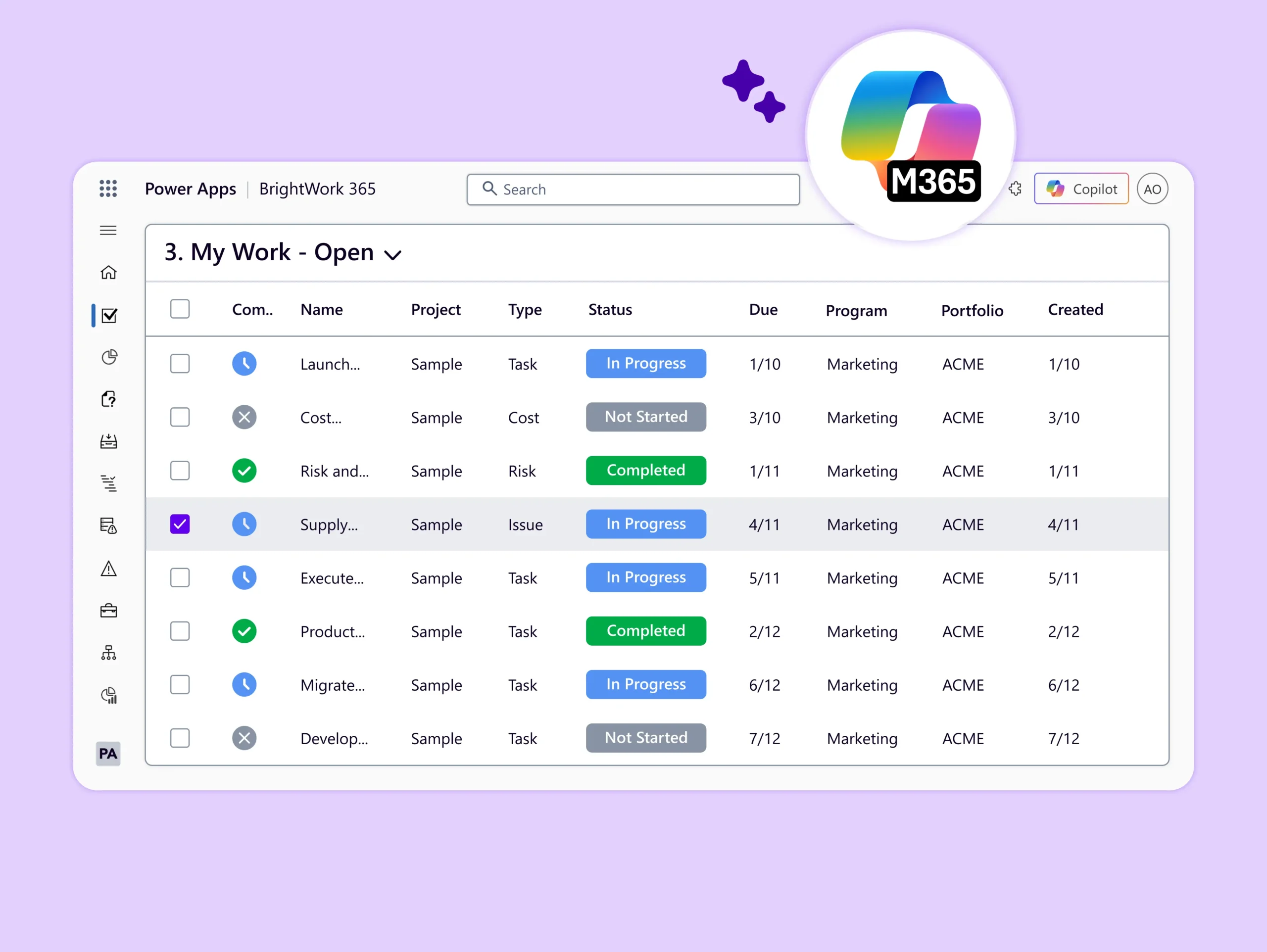 See all work (tasks, deliverables, issues, and risks) across all projects in one place.