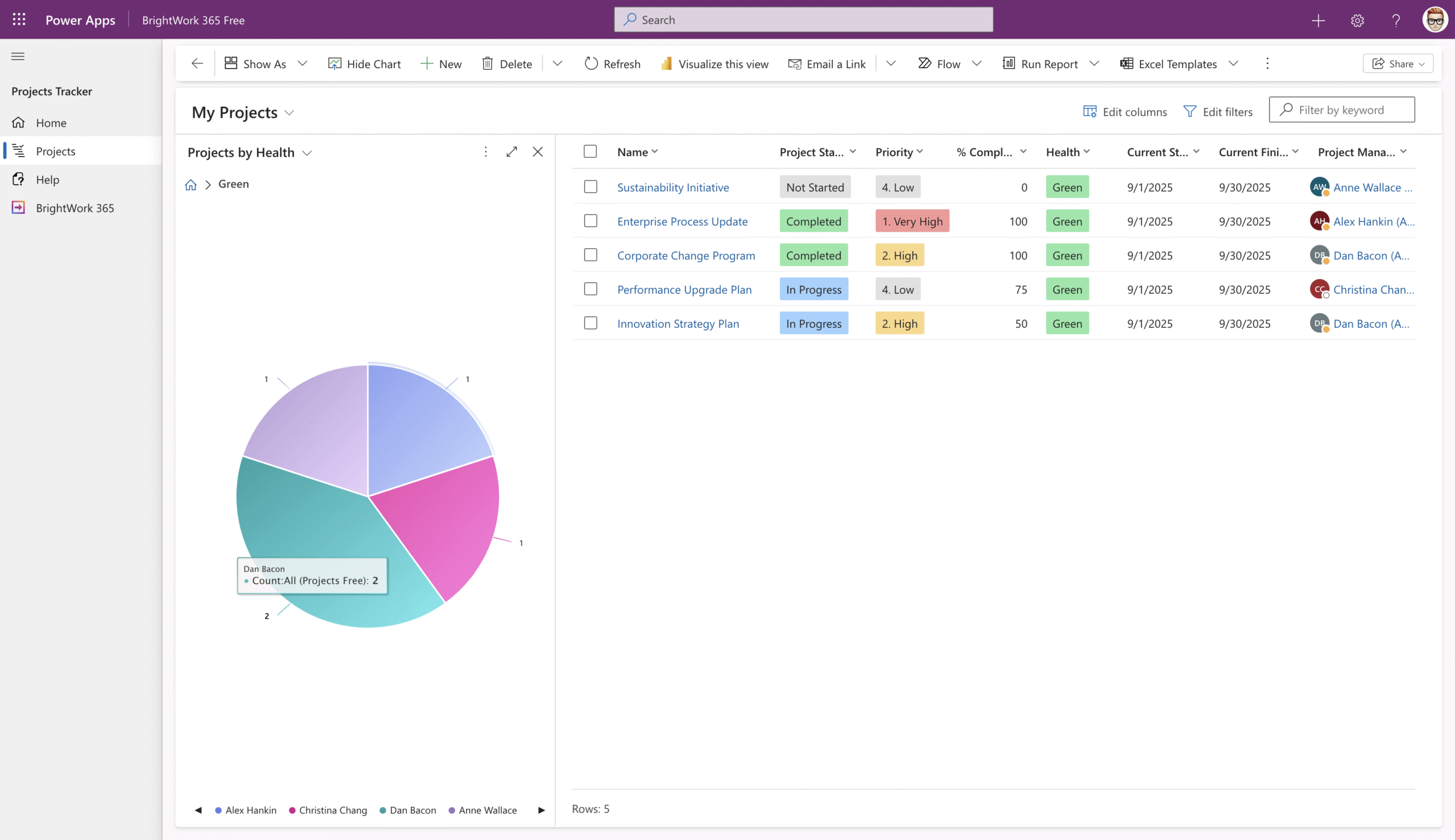 BrightWork 365 Free is a streamlined project tracking app built on Microsoft 365 and the Power Platform. Track unlimited projects with unlimited users, without the complexity of traditional project management tools.