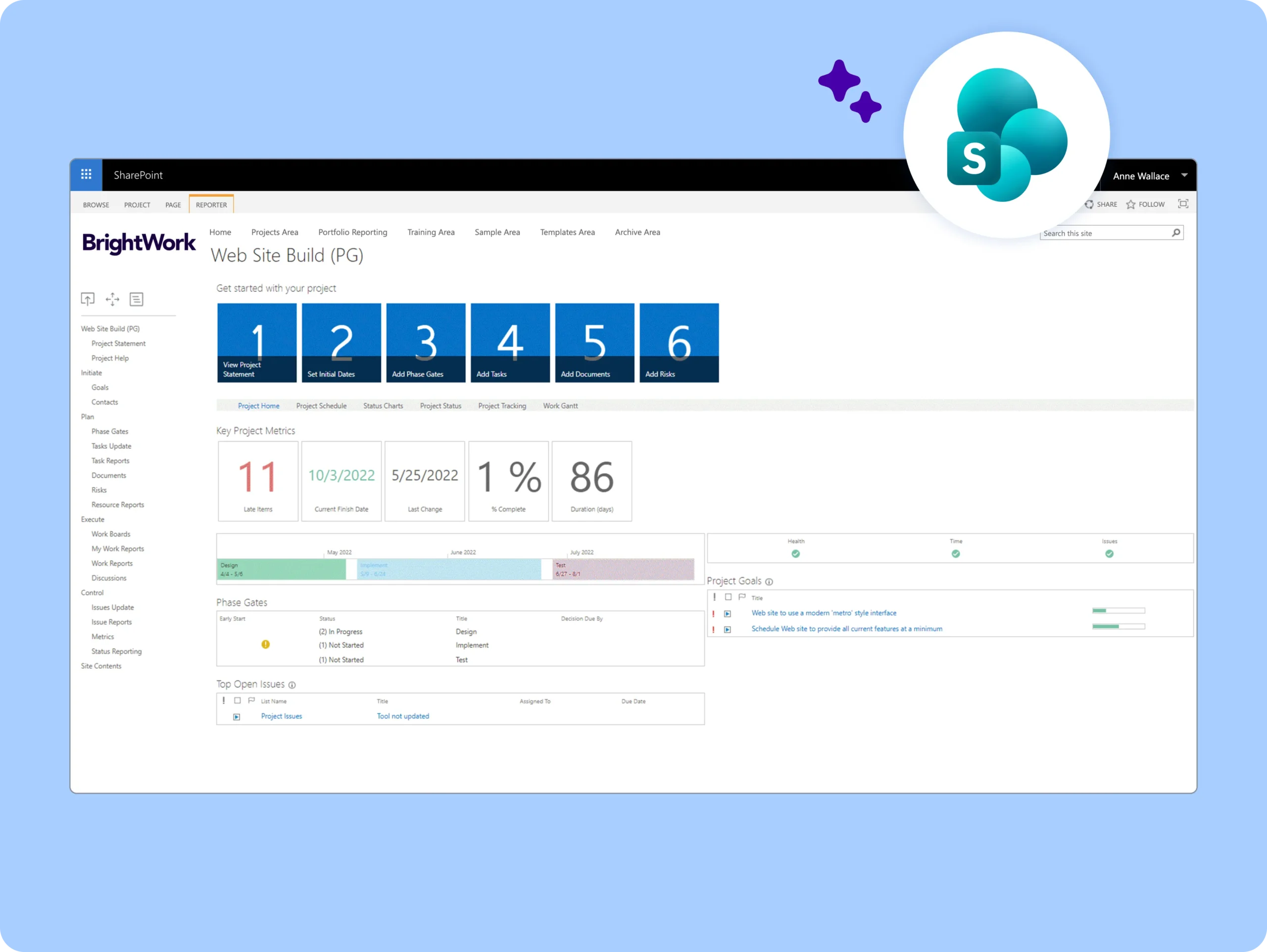 The Project Standard template is a single SharePoint project site for tracking one project with a medium amount of project management.