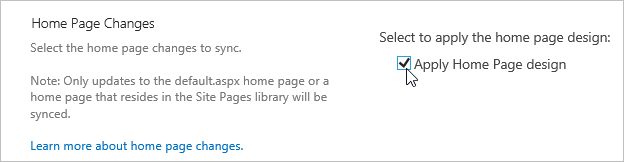 The Apply Home Page Design feature of Design Sync enables you to replace the home page in a project site with the home page in the template. You may want to do this to reapply the original home page from the template (to eliminate any design changes made to the home page in the project site) or you may want to do it to propagate a new home page design (such as new added web parts or changes made to existing web parts).