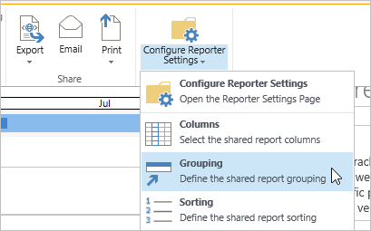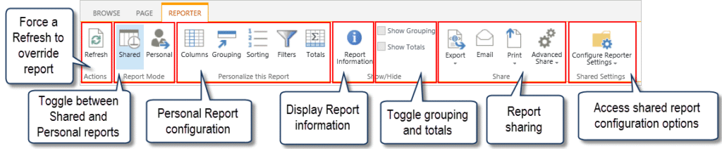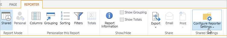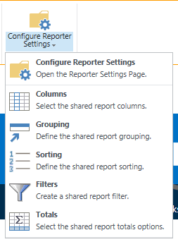 The Reporter Tools ribbon offers quick configuration access for certain report types. To change things like the columns displayed in a report, the grouping and sorting, display of totals and create report filters, use the Reporter Tools ribbon. The Reporter Tools ribbon also allows you to create a personal report.