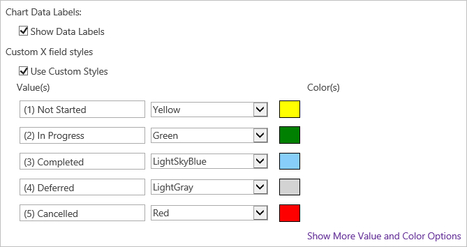• Click Show More Value and Color Options and set the chart up as follows.