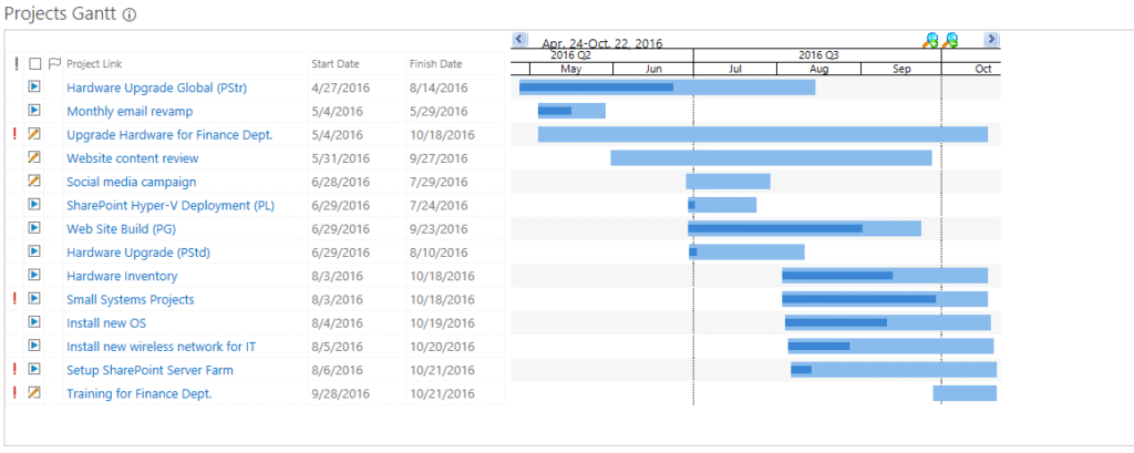 A Gantt chart provides a graphical illustration of items in a schedule that helps to plan, coordinate, and track specific tasks in a project. To show items correctly, the Gantt report needs a Start Date and an End Date.