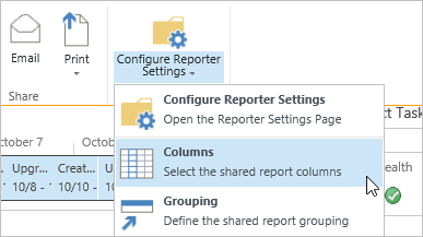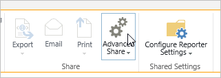 • Click in the header of the Project Summaries Web Part to expose the Reporter ribbon. Click Configure Shared Reporter Settings.