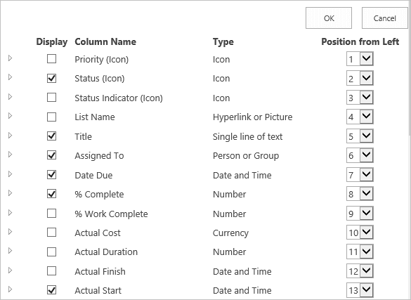 • Unselect the Priority (Icon), Status Indicator (Icon), and List Name columns.