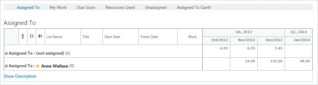 Resource Usage reports display how much work has been assigned and allocated in a calendar-like view. The report shows the hours allocated to a particular item and to the grouping(s) selected on the Reporter settings page (e.g. Assigned To, Role, List Name, Project etc.).