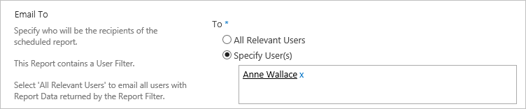 NoteYou can use [Me] to place the recipient’s name in the title, e.g. Open Work Assigned to [Me]. This will generate the title: Open Work Assigned to Anne Wallace.