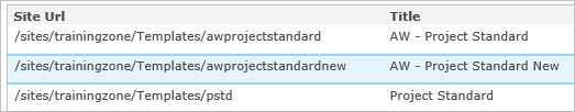 Recall the Create a Training Project Office Guide in which you created templates and sites. Navigate to the Templates Area and see if you can remember how to create a new template called “ {your initials} – Project Standard New” using the Training – Project Standard template that you used to create a template in that guide.