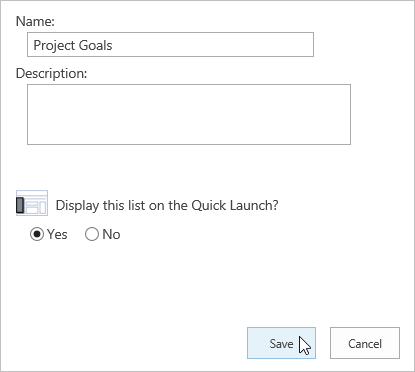 • Select the Quick Launch checkbox.You need to do this because you also want the Goals list you added to appear on the Quick Launch of the site.