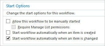 • Unselect Allow this workflow to be manually started and select Start workflow automatically when an item is changed.