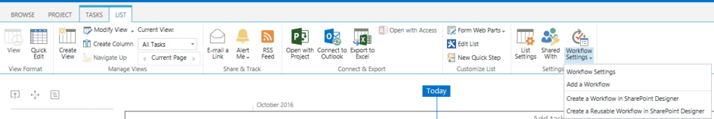 • Click List | Workflow Settings | Create a Workflow in SharePoint Designer.