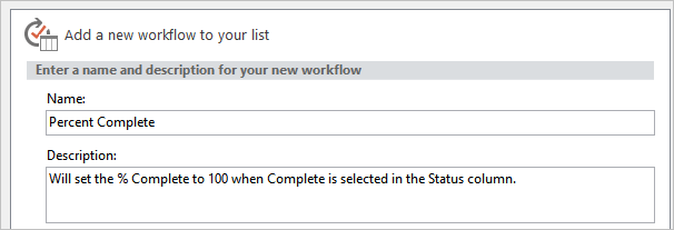 Add the Percent Complete workflow to the site created from the Project Lite template.
